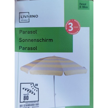 Colore giallo e grigio a righe. Con custodia. Facile da trasportare a mano. Formula anti raggi UV. Diametro 180cm e altezza regolabile da 170 cm a 220cm. Si piega fino a 80°
